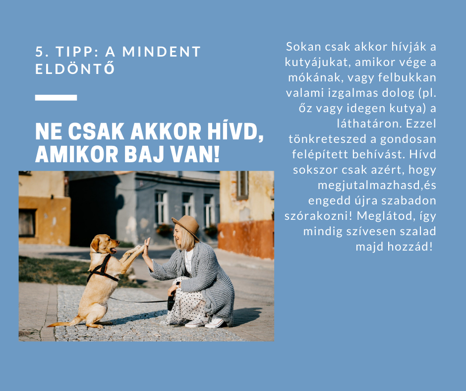 Hívd gyakran egyszerűen csak azért, hogy megjutalmazhasd, egy jót játszhass vele, aztán engedd is vissza szórakozni! Ne csak akkor hívd, amikor baj van! Meglátod, így mindig szívesen szalad majd hozzád.