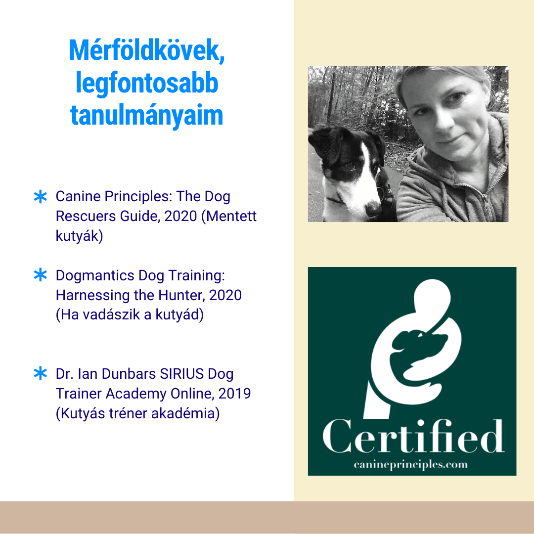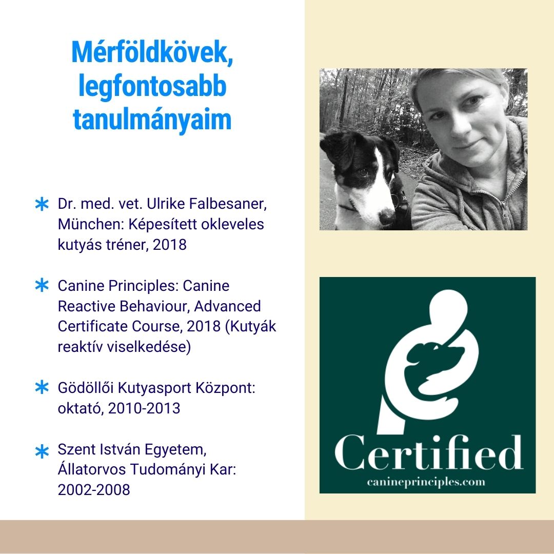 Az ezt követő években rengeteg dolgot kipróbáltam, keresgéltem az utamat, de a kutyázás végig jelen volt az életemben. Végül 2014-ben párommal és kutyáinkkal együtt Németországba költöztünk. Itt is folytattam a tanulást, elvégeztem többek között a Canine Principles tanfolyamát, melynek témája a kutyák reaktív viselkedése (Canine reactive Behaviour) volt, valamint letettem a németországi kutyakiképzői vizsgát, mely feltétele az ottani kutyás munkának. 2021 januárja óta családommal újra Magyarországon élünk.